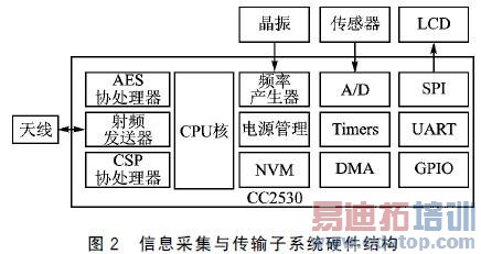信息采集与传输子系统采用CC2530作为硬件结构的核心。CC2530内部集成了业界领先的射频收发器、丰富的片内外设和强大的DMA控制器。集成的射频收发器的性能指标远远优于IEEE 802.15.4标准所规定的要求。丰富的片内外设,如AES协处理器、CSP协处理器和SPI等通信接口,为各种基于ZigBee、6LoWPAN和RF4CE等协议的应用提供了有力的支持。强大的DMA控制器为CC2530在高强度、高吞吐量以及实时性要求严格等领域的卓越表现提供了可靠的保证。LCD采用FSTN显示模式的LM6059BCW液品模块。信息采集与传输子系统硬件结构如图2所示。