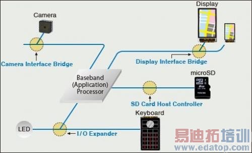 东芝推出了名为"移动外围器件(MPD)"的接口桥接芯片,可支持高速数据传输协议,比如 MIPI、LVDS、Display Port和HDMI。东芝的MPD不仅可以高速传输数据,也可以桥接主要的处理器和不同接口的外围设备。东芝也推出了广泛的外围设备产品组合,比如输入输出扩展器件和SC卡控制器等。