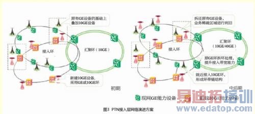 接入层网络演进思路如图3所示:业务发展初期,在部分热点区域,根据接入点实际物理位置,在新站址机房、光缆配套资源具备的情况下新建具备10GE组网能力PTN设备,可以选择GE或者10GE环组网;业务发展中后期,随着业务量的进一步增长,一方面,将新建GE环升级为10GE环,另一方面,将原有GE能力PTN设备环网进行拆环、缩环以及将部分节点直接下挂至10GE环,提升GE能力PTN设备环网每个节点的接入带宽能力。这样可以做到网络的平滑演进,对现网冲击小,而且保护了网络投资。