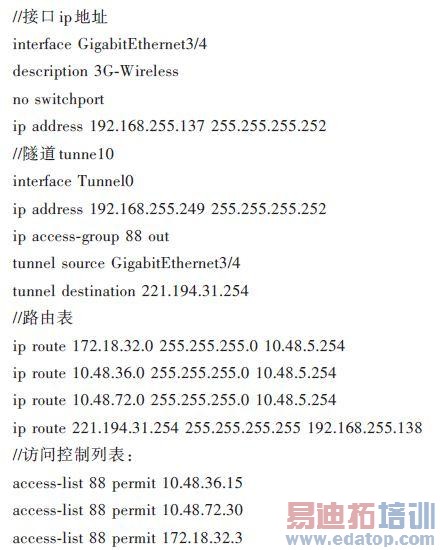 (4)配置访问控制列表。基于业务和运行成本的需要,配置一个access-list 88控制3G辅助通道的访问。
