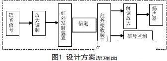 利用950nm近红外波段的红外线作为传递信息的媒体,通过自然空间作为通信信道,发射系统采用电信号转换放大、调制,驱动红外发射管以红外光为载体发出光信号。红外光信号经过空间无线传输到达接收端。接收端将接收到的红外光信号后进行解调、放大、滤波、等处理后送给输出端,从而实现通信过程。监测电路用于对信号进行监测。其设计方案原理见图1。