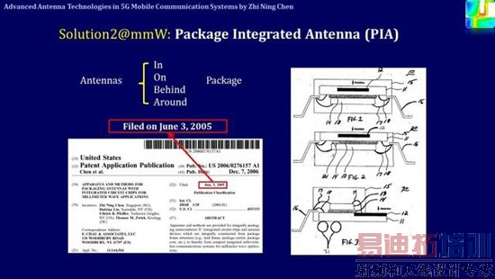 第二个解决方案是把天线设计在封装(package integrated antenna,即PIA)。因为天线在芯片上最大的问题就是损耗太大,而且芯片本身的尺寸很小,把天线设计进去会增加成本,所以在工程上几乎无法得到大规模应用。如果用封装(尺寸比芯片大)作为载体来设计天线,不仅能设计出单个天线,还能设计天线阵列,这就避免了硅上直接做天线在体积、损耗和成本上的限制。