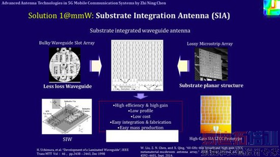 第一个方案是,衬底集成天线(substrate integrated antenna,即SIA),这种天线主要基于两个技术:空波导传输的时候介质带来的损耗很小,所以可以用空波导来进行馈源传输,但这存在几个问题,因为是空气波导,尺寸非常大,而且无法和其它电路集成,所以比较适合高功率、大体积的应用场景;另一个是微带线技术,它可以大规模生产,但它本身作为传输介质的损耗很大,而且很难构成大规模天线阵列。