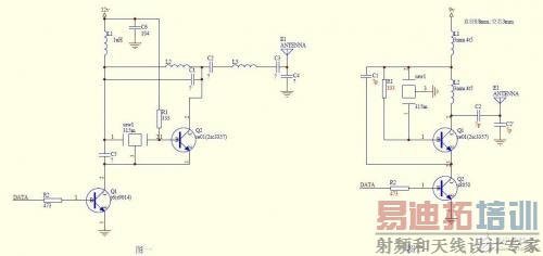 两电路基本原理一致,都是由0、1信号控制实现高频脉冲发射的电路,工作频率由晶振决定,从稳定性上分不出优劣。图二电路简洁,稍容易调试些,图一在三极管集电极与电源间加了选频网络,在三极管集电极与天线之间也加了选频网络,输出频率更纯净,但调试要麻烦些。再一点区别是图二上方三极管的基极通过电阻引入了交流负反馈,其实这对该电路稳定性的影响也并不明显。电源上对地的高频电容还是保留为好,但图二中没有画出。