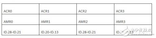 如上表所示,ACR寄存器是接收代码寄存器,AMR是接收屏蔽寄存器。ACR一般是需要与对应的ID相吻合的,但是如果AMR的相应位上设置为1的时候,ID的那一位数据可以不和AMR的相应位一样,也就是起到屏蔽的作用。