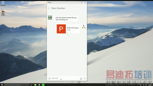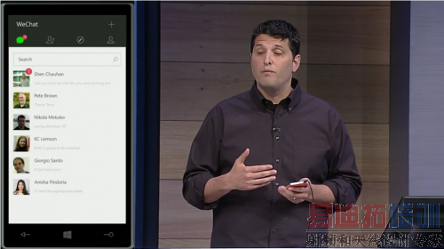 如微软操作系统总裁 Terry Myerson 演示的,新版微信能同时运行在 Windows Phone 10 和 Windows 10 上,并共享状态。用户在手机中开启一个对话,桌面系统的通知中心能实时收到相同通知,同时桌面应用运行后也会开启同一对话。