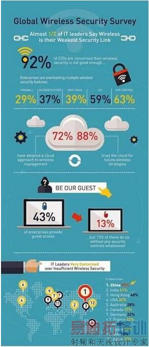 其他主要的研究发现包括:将近一半的IT决策者(48%)认为不安全的无线网路环境的最大风险,是机密企业和(或)客户资料的外泄;72%的受访者已采行云端的方法来管理无线网路架构?;88%依靠云端进行未来的无线网路部署;43%受访的IT决策者提供访客使用企业无线网路;其中13%完全没有任何管控机制。