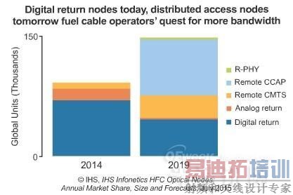 2014年全球HFC光节点销售收入年增14%至3.56亿美元。 2014年,全球光节点销售收入中,80%来自数字Return节点,15%来自模拟Return节点。 到2019年,IHS预测所有新的物理节点中,35%为远程CCAP设备、27%为R-PHY单元、23%为传统数字Return节点。 2014年,Arris公司在销售收入和物理节点出货量方面都是领导者。