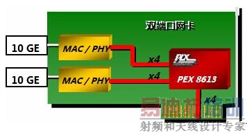 世强代理的PEX 8613可以应用在通信行业,如网络接口卡(NIC)。像图2中所示,可以利用PEX8613的扇出能力。该实例中,采用PEX8613开发一个x4链路连接到主机和两个x4下游链接到扇出的10GE端口。该PEX8613的通信功能允许端点没有任何相互连通干预或管理主机。