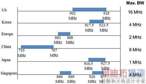 美国分配到902M∼928MHz的频率范围,最大频宽是16MHz;中国配置的总频宽是32MHz,频率范围为755M∼787MHz,最大频宽是8MHz;韩国针对802.11ah通道配置917.5M∼923.5MHz的频率范围,最大频宽是4MHz;日本有十一个1MHz通道,频率范围为916.5M∼927.5MHz;新加坡频率范围分成两段,分别是866M∼869MHz及920M∼925MHz,总共是8MHz,最大频宽是4MHz。