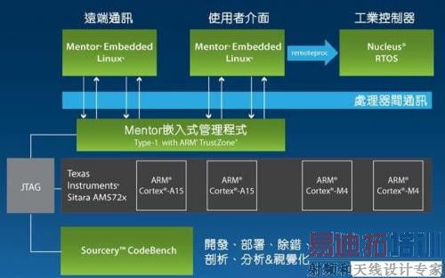 图2:利用客制化智慧闸道器的工业IoT环境能够简化网路拓扑结构、降低成本并提高营运的可靠性 (来源:Mentor Graphics) 客制化连线能力通常必须使用硬体和软体。例如,如果工业自动化企业需要在边缘网路整合连接EtherCAT的新装置,企业则可受益于闸道器中整合的EtherCAT硬体以及随附的软体协议堆叠以及与传统介面的整合。 满足安全性 IoT网路中融入多少安全性取决于多个因素,但这一切永远始于以下基本问题:"我要保护什么以及它是否值得?"正如所预期的,答案可能是微乎其微,也可能极其重要。在某些情况下,标准的网路安全(SSL和HTTPS)、防火墙、加密的资料库以及校验和安全可能就足够了。而在其他情况下,企业可能需要硬体强制的安全分区(如ARM TrustZone环境)、启用认证的身份验证,或者来自像Icon Labs等供应商提供检测边缘网路安全事件并向企业报告的安全解决方案。安全客制化需要全面分析和研讨,以便于从系统角度定义安全攻击层面,然后在硬体和软体中客制化一款解决方案,以充份解决安全风险。 闸道器处理要求 正如VDC所说的,智慧闸道器基本上是一种功能强大的应用平台。 而使用先进的多核SoC就是其中一个重要的嵌入式趋势。例如,Mentor Graphics智慧闸道器系统设计套件(SysDK)的基础就是NXP i.MX6(基于ARM Cortex A9)四核心处理器。该处理器已经为绘图性能实现最佳化,支援高性能显示器、数位电子看板以及相关的绘图应用。有些客户可能需要以NXP LS1021A(基于ARM Cortex A7)为基础的闸道器,因为该闸道器已针对网路输送量进行最佳化。在其他情况下,根据不同的要求,客户可能希望使用更复杂的异质SoC,例如TI Sitara AM572X,包括2× Cortex A15 + 2× Cortex M4 + DSP。 因此,当我们谈到智慧IoT闸道器时,应同时客制化硬体和软体。如果客户需要强大处理能力进行智慧处理,包含SMP模式下执行多个作业系统(OS)或一个OS的四核心处理器可能是不错的选择。或者,如果是为了更基本的处理,一个OS和单核心处理器可能就足够了。 由于SoC日益复杂,"安全聚合的闸道器"(secure converged gateway)概念已成为讨论主题。何谓安全聚合的闸道器?关于安全,它是指随着智慧从云端推向边缘网路,以及更多私人装置和可能公开的装置连接到闸道器,将会不断出现安全问题。聚合的概念是指在许多产业中,功能的聚合是减少空间、重量、功耗和成本(通常指SWaP-C)的一种方式。 客户目前都在探讨将安全、专有能力以及开放源码环境聚合至更强大的智慧闸道器(以日益复杂的SoC为基础)。这不再仅限于讨论现成可用的闸道器,而是针对客制化以及建立充分利用基础硬体并满足企业不同需求的闸道器。 为了性能和IP保护,的确需要聚合基于Linux的开源应用与专有应用。在某些情况下,公司会利用异质核心来进行电源管理,例如TI AM572x,其中,高耗电的Cortex A15核心在不需要时会进入休眠模式,同时M4核心负责执行所有的必要功能。 这一类复杂的设计还需要使用一个工具解决方案,让开发人员可以从整个系统的角度设计、开发和除错异质架构。例如,Mentor Graphics多核心架构和异质解决方案就是专为解决这些系统设计复杂度而设的,如图3所示。