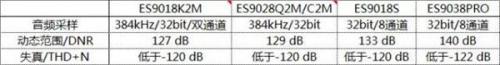如上图所示,从ES9018K2M到ES9028Q2M/C2M,相比ES9018S在关键指标上逐步缩短距离,另一方面,ES9038PRO这块新品芯片在关键指标上继续作出突破,DNR和THD N提升到新的高度。