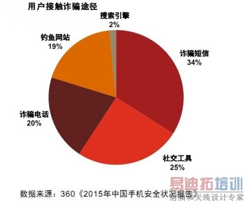被骗手机用户接触诈骗信息的首要途径是诈骗短信,占比为34.0%,其次是社交工具25.2%,诈骗电话20.6%,钓鱼网站18.6%,搜索引擎1.6%。
