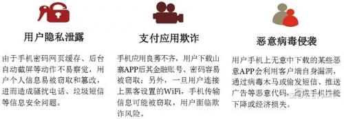目前移动支付主要面临三个方面的风险:用户隐私泄露、支付应用欺诈、恶意病毒侵袭。
