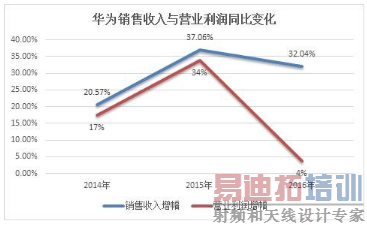 华为的整体销售收入在2016年同比增长了32%,但其营业利润的同比增幅则仅有3.8%。这一趋势从下图销售收入与营业利润三年间的同比变化可以看到清晰的展现,但2016年的差距之大还是出人意料。