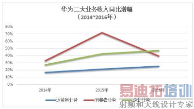华为的整体销售收入在2016年同比增长了32%,这一增幅低于2015年的37%,体量更为庞大是一个原因,但其中最大的影响还是消费者业务增速下降明显:从下表所示华为三大业务在三年间的业务收入同比增幅来看,2015年消费者业务收入同比增幅高达72%,对2015年整体收入增长的贡献率达到51%;而2016年的收入同比增幅已下降到44%,对2016年整体业务收入增长的贡献率也只有40%,低于运营商业务的贡献率。