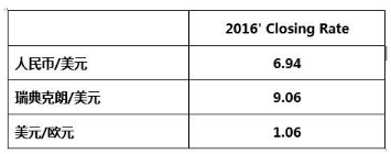 需要说明的是,四家通信厂商总部分处不同国家,财报数据所用货币单位也各不相同:华为和中兴采用人民币,爱立信采用瑞典克朗,诺基亚采用欧元,因此为便于横向比较本文将各家财务数据统一折算为美元来进行核算;同时由于华为在其财报中已经按照2016年12月31日的年终记账汇率将其财务数据折算出美元金额,因此在折算其他三家的财务数据时也统一使用年终记账汇率来进行折算,以避免标准不一出现混乱。