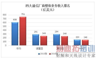 根据财报数据,四大通信厂商在2015~2016年的整体营收变化及排名情况如下图所示: