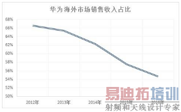 作为本土企业称雄国际市场的代表,华为在170多个国家开展业务的国际化战略一直受到推崇,其海外市场销售占比超过国内市场也是华为全球化运营成功的标志。但从下图五年间华为海外市场销售收入占比的变化趋势来看,海外市场销售占比一直处于连续下滑状态,特别是2016年的占比回落到55%,如果这一趋势没有扭转的话华为的海外销售收入将很快被国内反超。