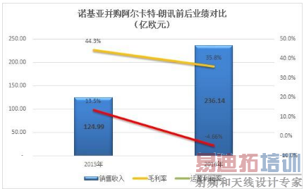 对于诺基亚而言,虽然其通过并购阿尔卡特-朗讯的强势扩张打破了通信设备行业的原有格局而跻身次席,但作为搅局者势必会引来竞争对手更为强力的反击,尤其在全球经济低迷、市场需求疲软的大背景下,诺基亚2016年的财报业绩只能说是差强人意:2016年合并报表后的业务收入与2015年两家合并前的数字相比,按欧元计算下降了12%,并出现了11亿欧元的运营亏损。
