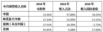 按照中兴在2016年财报中所称"本集团坚持人口大国和全球主流运营商战略,并在部分区域取得新的突破,逐步重塑市场格局"的说法,中兴在海外市场布局上的收缩态势明显,按人民币计算,2016年中兴在非洲市场销售同比下降了17.6%,欧美及大洋洲市场下降了11.5%,除中国外的亚洲市场下降了1.7。中兴在海外市场布局上的收缩,与其海外业务盈利能力差有一定的联系。如下表中兴在不同区域市场的毛利率水平所见,在发达的欧美及大洋洲市场和竞争激烈的亚洲(不含中国)市场,中兴的毛利率均远低于其国内毛利率水平,这与中兴一贯以低价冲击发达市场的策略有关,但同样也反映出出其在海外市场竞争实力弱和盈利能力差的特点。