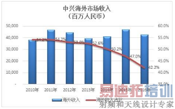 在营收规模与竞争对手拉开差距的同时,中兴2016年在海外市场的销售收入也同比下降了9%,在整体业务收入中的占比只有42%。把观察范围拉长,从下表中兴海外市场收入从2010年到2016年间的变化情况来看,海外市场收入在整体收入中的占比一路下滑,已经从当年的过半数滑落到4成左右,而其总体规模也始终徘徊在400亿人民币上下而没有进一步的突破。