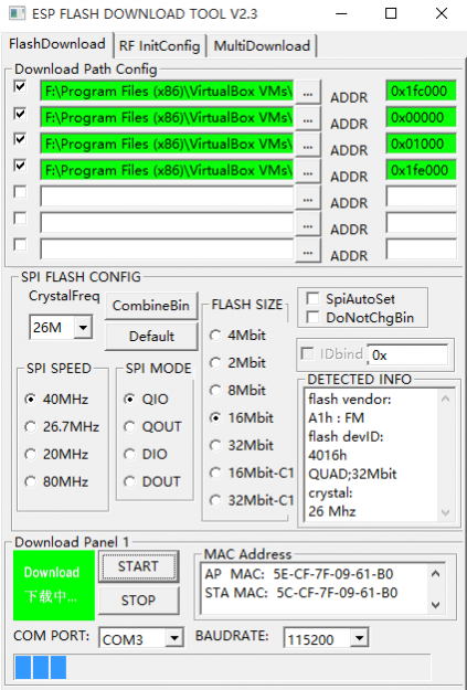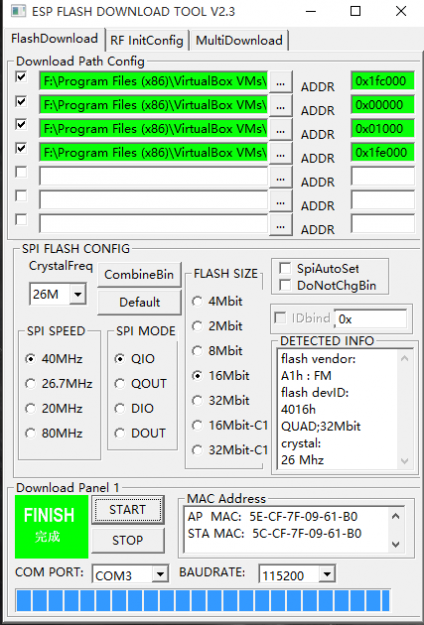 1.相关配置 1)最上面的地址要根据右边的图来对应相应的文件 2)配置FLASH大小16Mbit 3)设置串口号,波特率