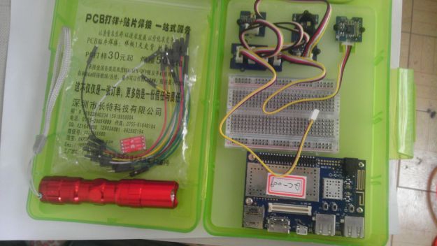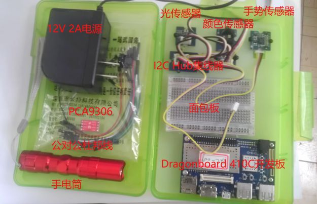 感谢电子发烧友,申请的DragonBoard 410c开发板套件非常幸运的如期而至,包装非常简洁,采用绿色透明塑料收纳盒,像个小巧工具箱,非常有意思,里面装有Dragonboard 410c开发板+面包板+公对公杜邦线+PCA9306 I2C总线和SMBus双向电平转换器+光传感器+颜色传感器+手势传感器+I2C集线器+红色骚红手电筒(用于光感应测试)+I2C模块连接线