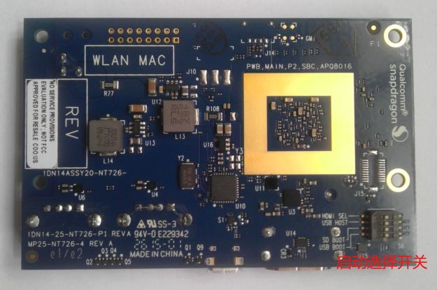 Dragon 410c开发板背面印有高通骁龙英文Logo,右下角带一个启动选择开关,如下图