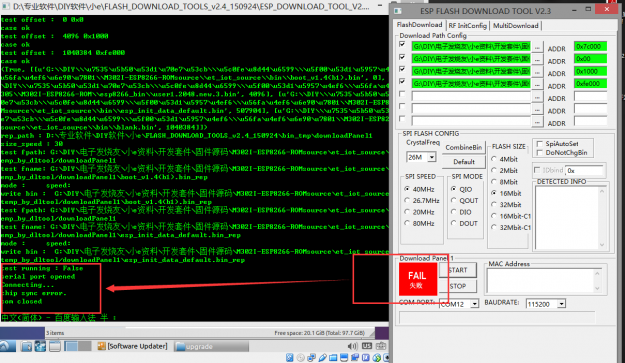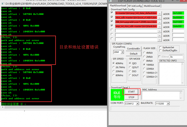 文件地址配置好和基本设置弄好之后点击start开始烧录:结果DOS信息提示烧录文件地址配置错误;