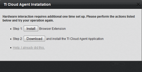 提示需要安装一个浏览器插件和TI Cloud Agent Application软件,按要求安装就可以。点Help,I alredy did this链接会打开TI的帮助页面。如果遇到不能下载浏览器插件的情况,可以通过修改hosts文件的方式解决(具体操作请自行搜索或者联系本文作者)。