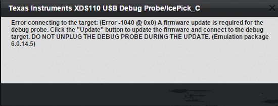 编译程序时,也会遇到提示仿真器升级的提示。不升级进行不下去了。在TI官网搜索了下要升级的版本,确定没问题后,可以点Update进行升级。