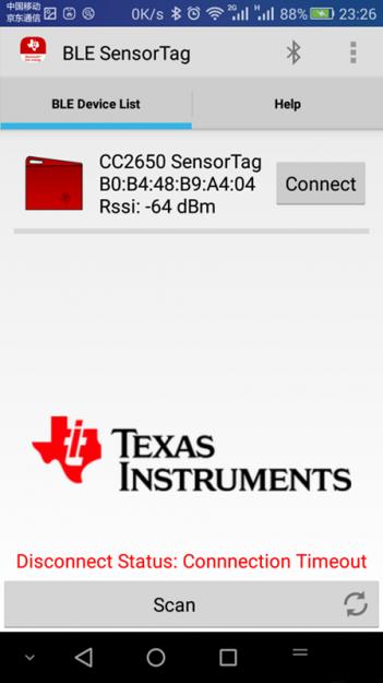 解决了上述两个问题,编译完程序,会自动下载到CC2650STK。然后可以验证程序的运行情况了。在手机上的App点Scan搜索CC2650STK,可以找到设备,点Connect,能进入传感器数据的界面。但稍等几秒钟,仍然无法显示传感器的各项数据,最后会返回Scan界面,并提示Disconnect Status:Connnection Timeout。说明我们正确的编译并下载了新的程序,虽然程序有问题不能正确运行。好吧,看来稍后使用CC2650STK的时光,我也是被美女调教的命运。