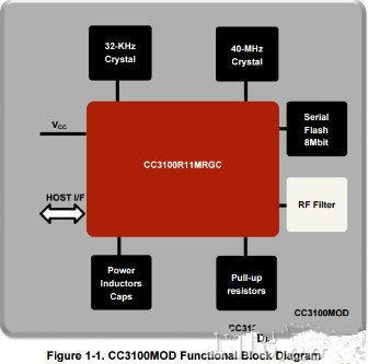 核心CC3100MOD: 供电电压2.3 to 3.6 V,与主控芯片通过SPI/UART接口实现通讯; 支持网络802.11bgn,多重角色Station,APT和Wi-Fi直接模式;最大传输速率TCP可以达到13Mpbs,UDP可达到16Mpbs;Wi-Fi接收灵敏度-94.7dBm at 1DSSS,在54OFDM下接收电流53mA,发送电流223mA。Hibernate模式下电流7uA,只要SW3按一下就能在50ms醒来。CC3100MOD整体结构图: