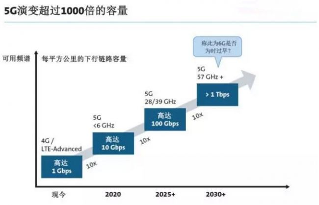 下图突出显示了5G在演化成熟的过程中能够达到的总容量。假设容量需求每两年翻一番——该假设基于以往的经验——在6 GHz以下所提供的容量得到充分利用之前,不需要毫米波提供额外的容量。虽然可能会在特定位置更早地部署较高频段,但随着5G发展过程的自然推进,这些将成为个例而不是普遍规则。世界已经迎来了5G发展的关键时刻,对于通信行业来说这也是激动人心的时刻。