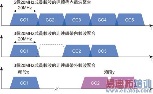 由于频宽与资料吞吐量是两个典型的正相关因素,频宽愈大,吞吐量愈高。一般来说,一部手机在同一时间只使用一个频段内的一个载波,透过整合两个频段或同一频段的多个载波(图2),就达成所谓的载波聚合,可利用更多射频(RF )资源,扩增有效频宽。目前在所有的连续频谱分配中,超过90%的频谱只能空出15MHz的频宽或更低,大部分甚至低于10MHz,这一限制使很多营运商须使用载波聚合,否则很难支持100Mbit /s或更高传输速率。