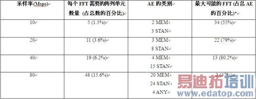 表2总结了PC102上的256点FFT的性能。表2给出了复杂采样速率在10MSps和80MSps之间的256点FFT所要求的资源,并给出了在PC102上能以每个速率点执行的最大FFT数量。从表中可以看出,单个10MSps FFT需要约1.5%的资源。