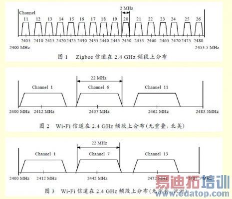 Zigbee 工作在工业科学医疗(ISM)频段,定义了两个物理层,即2.4 GHz频段和868/915MHz 频段物理层,而868MHz 和915 MHz 的ISM 频段分别只在欧洲和北美有,所以其主要工作于全球范围内免许可证的2.4 GHz 的ISM 频段。必然会与工作在该频段的Wi-Fi 产生相互干扰。