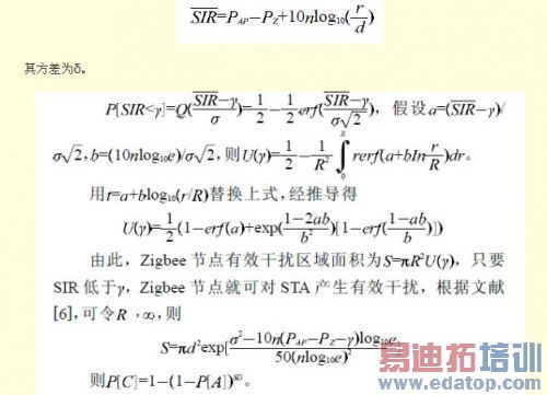 根据文献[5]和[6],对于一个半径为R 的覆盖区,假设STA的SIR 的阈值为γ (如果Zigbee 节点要对STA 产生有效的干扰,使其SIR 必须小于γ ),则有效干扰区域的百分比为U(γ )(即对于STA的SIR低于γ的区域百分比),如果在半径范围内导致SIR低于阈值的概率为P[SIR<γ] ,则:
