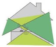 天线分集算法是如何抑制天线极化和方向性效应的呢?图5中,左图中黄绿部分表示使用一个天线时的通信覆盖范围,右图中的黄绿色区域表示天线与左图中的天线方向成90度放置时的通信覆盖范围。可以看到,使用一个天线时,不管天线放置的方向如何,都有很大的未覆盖范围。而从图6可以看出,使用两个天线和天线分集算法时,通信覆盖范围大为增加,黄绿色和绿色区域都是通信覆盖范围,实际上是两个成90度放置的天线的通信覆盖范围的叠加。通过这图5和图6的对照,我们可以看出,使用天线分集算法可以减弱方向极化和方向性效应的影响,扩展通信范围。