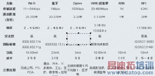 ZigBee、Wi-Fi、蓝牙和几种无线技术的对比图