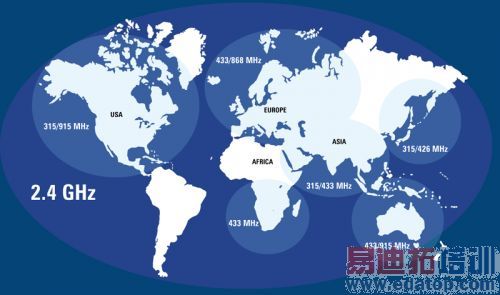 在实施无线传输以前,还必要对传输频率进行定义。图1显示了当今全球频率的分配情况。全球各地区低于1GHz的频率使用情况不尽相同。在欧洲,433MHz和868MHz均为免费使用,而在美国,免费使用的频段为315MHz和915MHz。只有2.4GHz 频段(Wi-Fi和蓝牙也使用该频段)在全球免费使用。此外,就868MHz和915MHz而言,可以使用相同的天线。只要具有一个灵活、自由可编程 的RF 收发器,一款可选择运行在868MHz或915MHz上的全球解决方案也是一个不错的选择。在这种情况下,必须要确保将运行频率转换至设备运行地区所允许的频段范围。这会增加成本,因为必须要发布两个不同的固件版本。