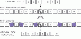 实践证明,DSSS 在有随机噪声或者可能会出现短暂突发干扰而导致个别片出错的环境中非常有效。如果系统在噪声干扰持续破坏随机位的环境中不使用 DSSS,数据包可能根本无法得以成功传输。