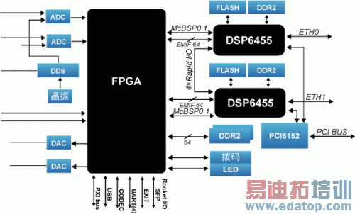 4.双DSP与FPGA采用EMIF和Mcbps连接,EMIF支持16bit、32bit、64bit宽度,速度100MHz。