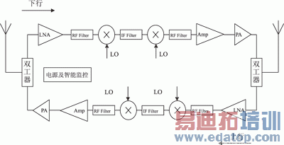 目前成熟的采用模拟方式处理的直放站框图如图1所示(以宽带直放站为例),其中,下行链路是直放站通过天线接收基站发来的信号,经过低噪声放大器(LNA)、射频滤波器(RF Filter)、混频器(下变频)、中频声表滤波器(IF Filter)、混频器(上变频)、射频滤波器(RF Filter)、功率放大器驱动模块(Amp)和功率放大器(PA),再通过天线发射出去;上行链路是直放站通过天线接收移动台(通常是手机或车载电话),经过与下行链路类似的处理后,通过天线发射给基站。