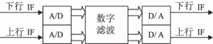 随着A/D、D/A及数字信号处理技术的发展,现在软件无线电技术已经可以用于直放站的中频滤波单元,如图2所示。采用图2所示的一个数字中频单元模块直接替换图1中的模拟中频滤波单元(IF Filter)模块(包括上行和下行两个模块),就基本可以满足目前所有体制标准的直放站硬件需求。这样,直放站的硬件平台基本达到了统一,只要采用不同的数字滤波配置代码,就可以实现不同标准的直放站功能。其中的数字滤波功能可以采用高速DSP芯片、FPGA或专用ASIC实现