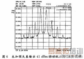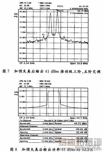 从频谱分析仪的输出波形图可以看到,在加预失真系统前,推动级输出41 dBm时的三阶交调分量,五阶交调分量的指标分别为-31 dB和-40 dB。对应地,当把预失真发生器接人系统后,可以看到输出的五阶交调分量,五阶交调分量均有了明显的改善,分别提高了14 dB和11 dB。此时,输出级ACPR的输出小于-52 dB。实验结果表明,该预失真系统在很大程度上改善了功率放大器的非线性失真,很好地优化了它的线性度。