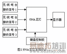 本设计主要包括输入、输出,子模块黑盒子(Black Box)声明,以及子模块之间的连接关系,子模块间的接口以及子模块与顶层模块的接口,设计所做的实验是基于Quartus II,它是Altera前一代FPGA/CPLD集成开发环境 MAX+plusII 的更新换代产品,其界面友好,使用便捷。在Quartus II提供了一种与结构无关的设计环境,使设计者能方便的进行设计输入、快速处理和器件编程。由于FPGA的原理、编程和使用方法已经有大量的文章论述了,本文不在此进一步解释程序中的编程。从结构上讲,本设计的整个定位系统总共由3部分组成, 它们分别是:功能控制键输入系统,3个无线电收音机报时接收器的并行输入系统,计算部分和显示部分。系统的结构框图如图2所示。每一个地方发送过来的信号的频率都是不一样的,所以系统根据设置不同的频率接收不同的电台报时。本设计中规定来自北京的接收信号1,来自上海的接收信号2,而来自武汉的接收信号3。在所需要的信号接受完后,经过FPGA芯片系统对接收信号时间间隔的运算,可以计算出设备所在地的具体位置,这个位置在显示部分显示出来,按键的作用是控制输入信号接受器和启动计算并显示。