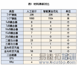 本文以某省市某运营商的室分站点设计图纸为测试案例,该案例的2G室分系统是GSM制式的,将在GSM上进行WCDMA改造。该案例的WCDMA改造采用BBU+RRU的方式实现,若采用人工方式进行改造设计,需要采用4个RRU,若是采用3G改造算法来优化,则在保证天线功率满足的前提下3个RRU就可以保证设计需要。在投资成本方面,原始投资为73147.11元,3G改造算法优化后投资为65549.30元。具体的材料清单对比见表1。