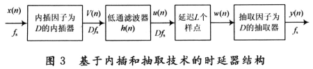 输入信号x(n)的抽样速率为fs,为实现延迟L/D个样点间隔,首先将x(n)的抽样速率增加到原来的D倍(即在x(n)的二个样点间插入D-1个零),速率提高后的V(n)序列经低通滤波器滤波,低通滤波器的作用是滤除间隔为原抽样频率重复出现的成分。V(n)是x(n)内插后的序列,其抽样速率为Dfs,u(n)在高抽样率上延迟L个样点后得ω(n),最后在ω(n)序列中,每D个样点保留一个即得到y(n)。y(n)是x(n)延迟了(L/D)T的序列,这里T=1/fs是原序列的抽样周期。在得出u(n)的过程中,经过的低通滤波器是FIR滤波器,V(n)序列经低通滤波器滤波时是利用